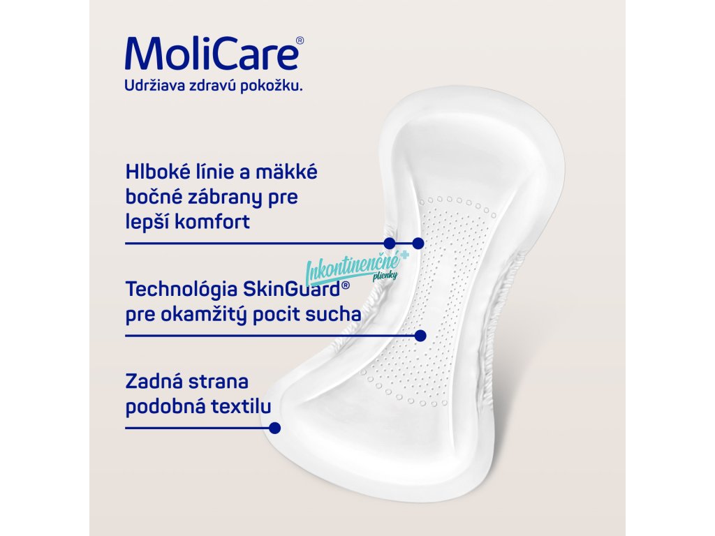 Diskrétne a pohodlné vložky MoliCare® lady Pad poskytujú spoľahlivú ochranu, rýchlo absorbujú moč a neutralizujú zápach. Patentovaná technológia SkinGuard® pomáha udržiavať pH rovnováhu a predchádzať podráždeniu pokožky. Anatomický tvar s mäkkými postrannými bariérami zaisťuje vyššie pohodlie a diskrétnosť. Vďaka širokému lepiacemu prúžku drží pevne na mieste. Sú o 29% tenšie v porovnaní s predchádzajúcou generáciou, dermatologicky testované a bez parfumov a latexu.