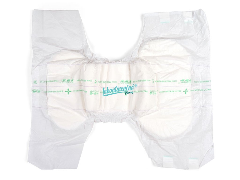 Inkontinenčné plienky COMBI majú trojité priedušné textilné jadro, ktoré je zárukou vysokej absorpcie. Spoľahlivo pohlcujú neželaný zápach, vďaka neutralizátoru zápachu. Po stranách plienky sa nachádza 3D vyvýšená ochrana pred pretečením. Na základe dvojitého istenia po obvode je plienka dostatočne uchytená o telo pacienta. Okolo nôh sa pomôcka prispôsobí vďaka elastickým vláknam bez latexu. Vďaka indikačnému pásiku na plienke je možné skontrolovať stav a nutnosť výmeny pomôcky.