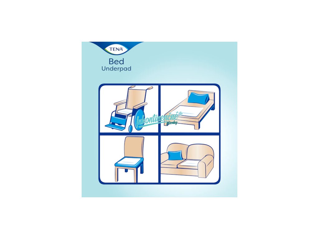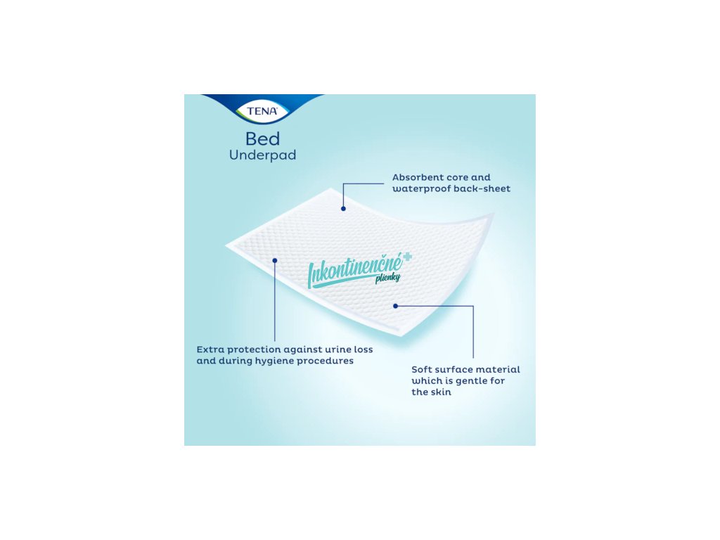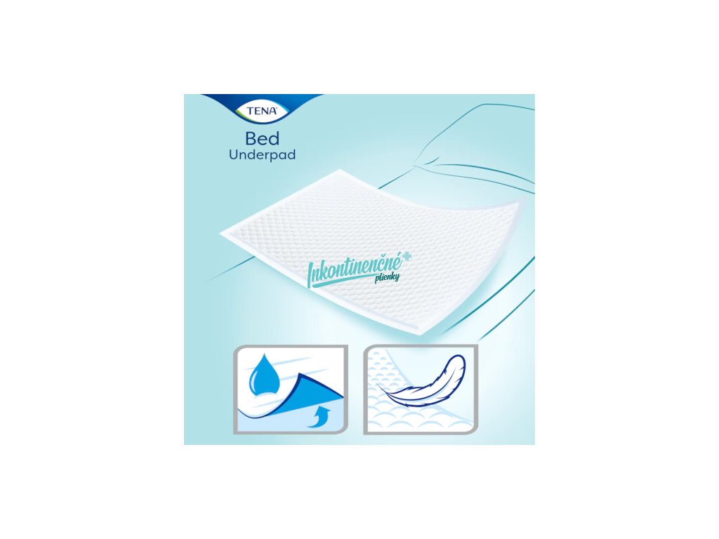 TENA Bed Normal je štandardná podložka na posteľ určená na inkontinenčnú starostlivosť. Je určená na zakrytie matracov, kresiel, sedačiek či invalidného vozíka pri náhodnom úniku moču. Ochrana postele vo veľkosti pre dospelých absorbuje tekutiny a vodoodolná spodná vrstva chráni každý povrch.