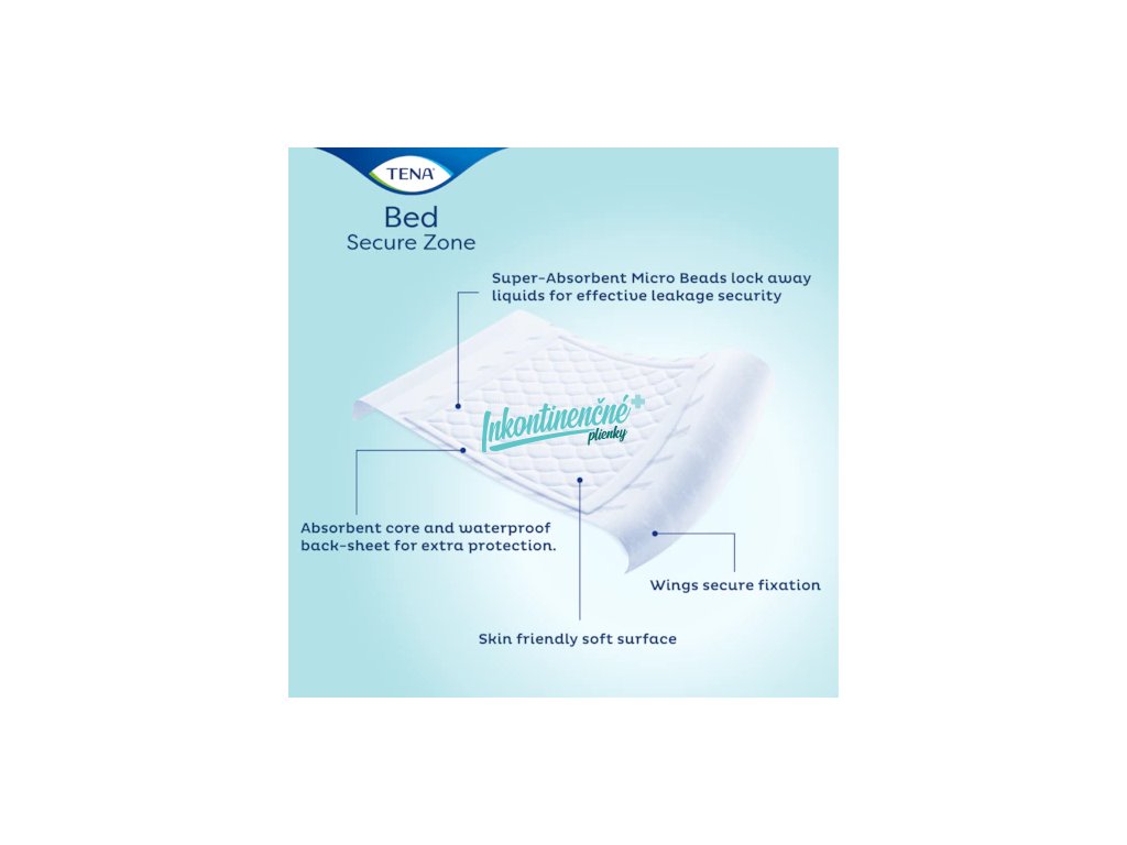 Ochranná pomôcka TENA Bed Secure Zone Plus Wings je jemná a spoľahlivá inkontinenčná ochrana postele. Vďaka praktickým záložkám zostane ochranný poťah postele na mieste, dokonca aj keď sa v posteli otáčate a prehadzujete.