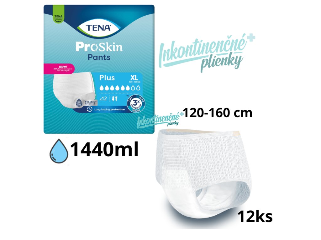 Nohavičky TENA Pants Plus sú jemné a pohodlné inkontinenčné nohavičky navrhnuté pre mužov aj ženy a vynikajúce na deň aj na noc. Na rozdiel od bežných plienok pre dospelých majú nohavičky TENA ProSkin Pants najnovšie technológie znižujúce vlhkosť, ktoré zaistia pocit sucha, zabezpečenie úniku aj systém kontroly vzniku zápachu. Pre absolútnu bezpečnosť vrstva FeelDry Advanced™ rýchlo odvádza tekutinu z povrchu a rýchloabsorpčné jadro okamžite uzamyká moč, dokonca aj vo väčšom množstve, vďaka čomu zostáva pokožka suchá a zdravie pokožky zachované. Tieto jednorazové nohavičky pri inkontinencii sú vyrobené z priedušných materiálov podobných textilu s vynikajúcou úrovňou absorpcie a s naťahovacím dizajnom podobným bežnej spodnej bielizni, vďaka čomu podporujú nezávislý a aktívny životný štýl.